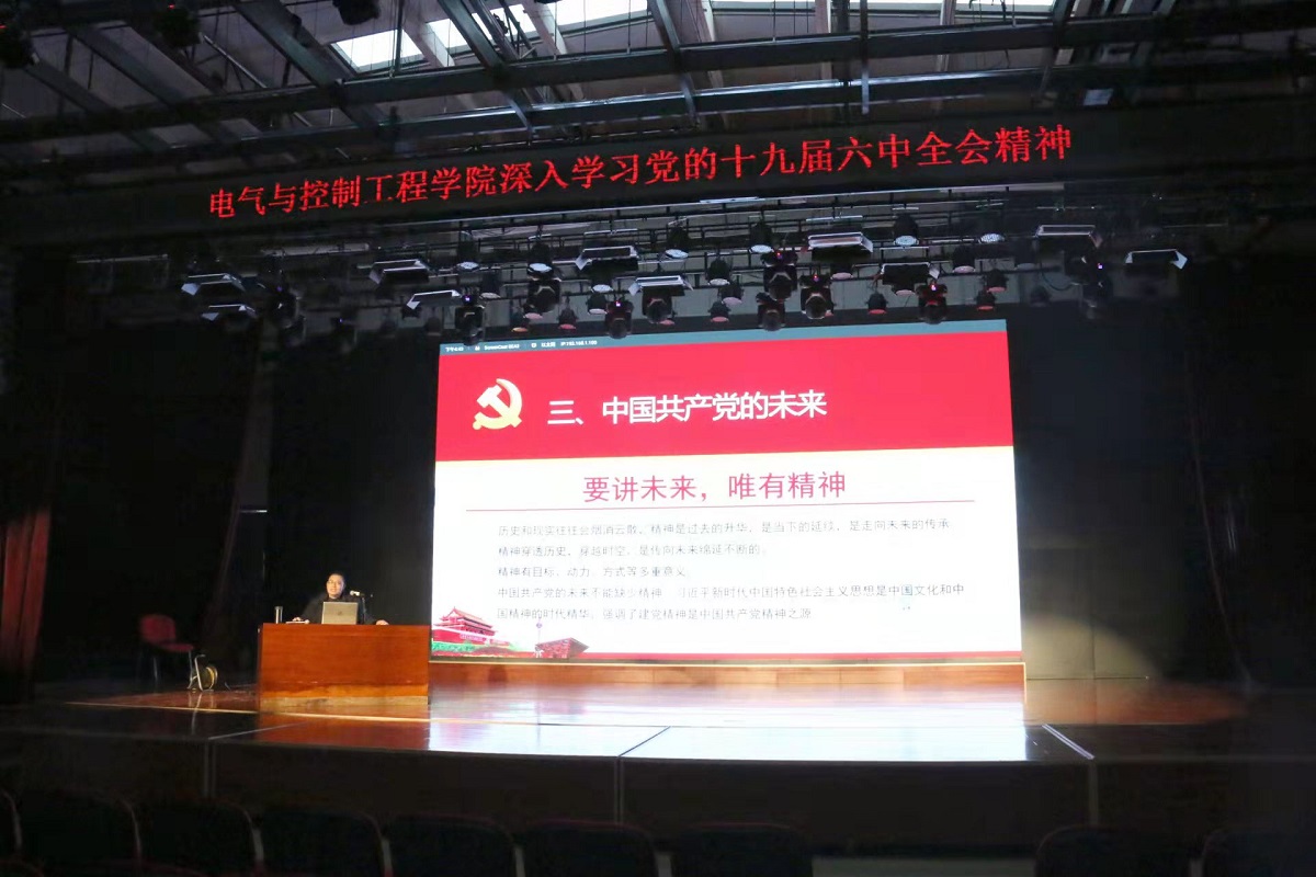 11月25日下午,電氣與控制工程學(xué)院黨委在學(xué)生綜合服務(wù)樓多功能廳召開了學(xué)院黨員大會,專題學(xué)習(xí)黨的十九屆六中全會精神。大會特邀我校黨的十九屆六中全會精神師生宣講團(tuán)成員、馬克思主義學(xué)院周守高老師作宣講報告,學(xué)院黨委委員、全體師生黨員共計300余人參加了大會,學(xué)院黨委書記李穎宏主持報告會。周守高老師從時空兩個維度、四個方面結(jié)合中國共產(chǎn)黨黨史深入解讀了黨的十九屆六中全會做出的大會決議報告。首先以“三個歷史決議”為引,...