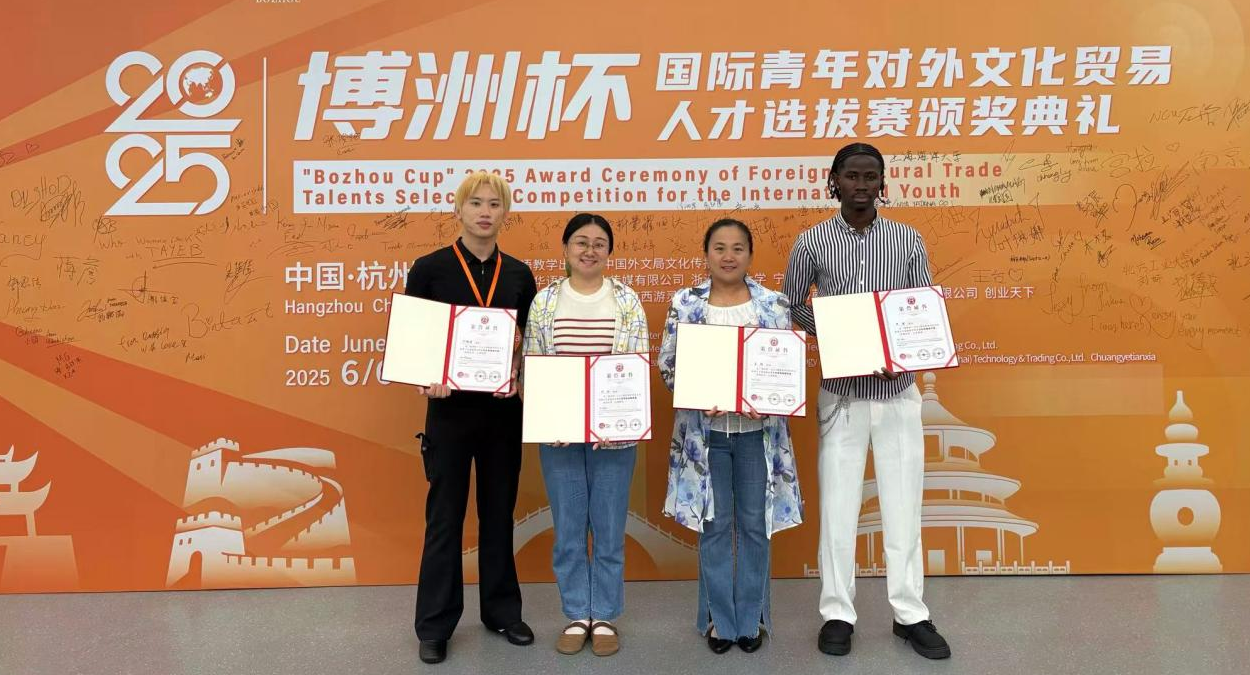 6月6日,由中國外文局文化傳播中心和華語教學(xué)出版社聯(lián)合主辦的“博洲杯”2025國際青年對外文化貿(mào)易人才選拔賽(以下簡稱大賽)頒獎典禮于浙江工業(yè)大學(xué)舉行。我校在本次人才選拔賽中取得佳績,其中劉德慶(印度尼西亞)和付博(科特迪瓦)同學(xué)獲得文化傳播活力獎,德島明日香(日本)、卡馬拉(岡比亞)、徐銀禧(韓國)、哈三(尼日利亞)等同學(xué)獲得文化互鑒友好獎。國際學(xué)院劉妍、吳維、季益靜、劉麗萍等教師獲得優(yōu)秀指導(dǎo)教師...