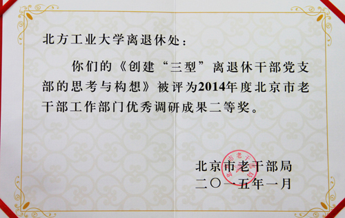 近日,從北京市老干部局獲悉,我校離退休工作處撰寫的調研報告《創建“三型”離退休干部黨支部的思考與啟示》榮獲2014年度全市老干部工作部門優秀調研報告二等獎。