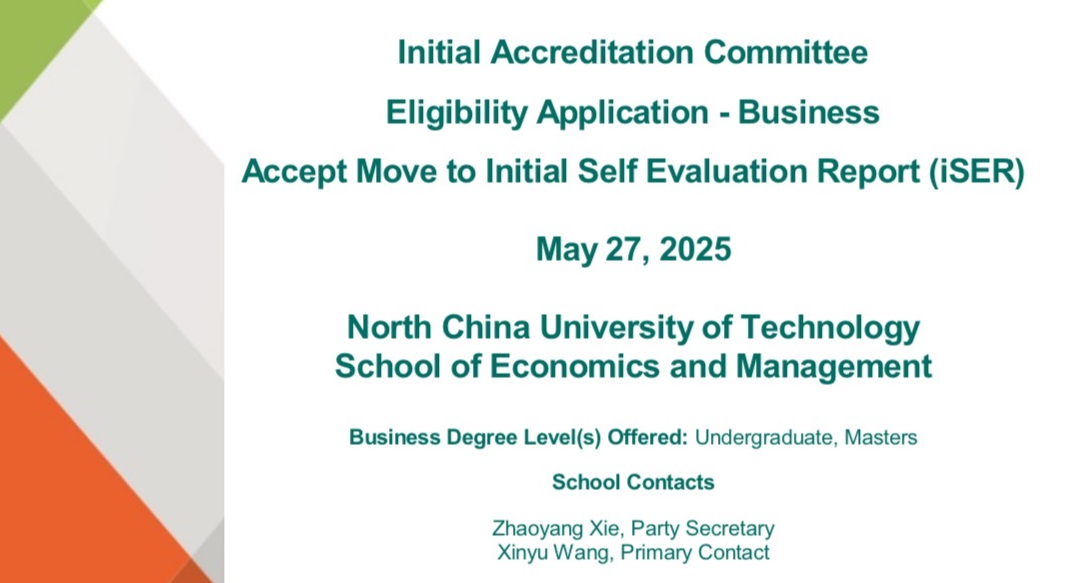 近日,我校經(jīng)管學院收到國際精英商學院聯(lián)合會(AACSB)認證委員會的官方通知:北方工業(yè)大學經(jīng)濟管理學院正式通過AACSB資格認證申請(EligibilityApplication,EA),這標志著我校商科專業(yè)正式進入AACSB認證互動階段。?經(jīng)管學院在學校大力支持下,全力投入AACSB認證工作。2024年10月8日學院正式提交AACSB會員單位申請,新聘期設立“國際化發(fā)展中心主任”專職崗位,聘任王昕宇副教授擔任學院國際化發(fā)展中心主任,成立認證工作領...