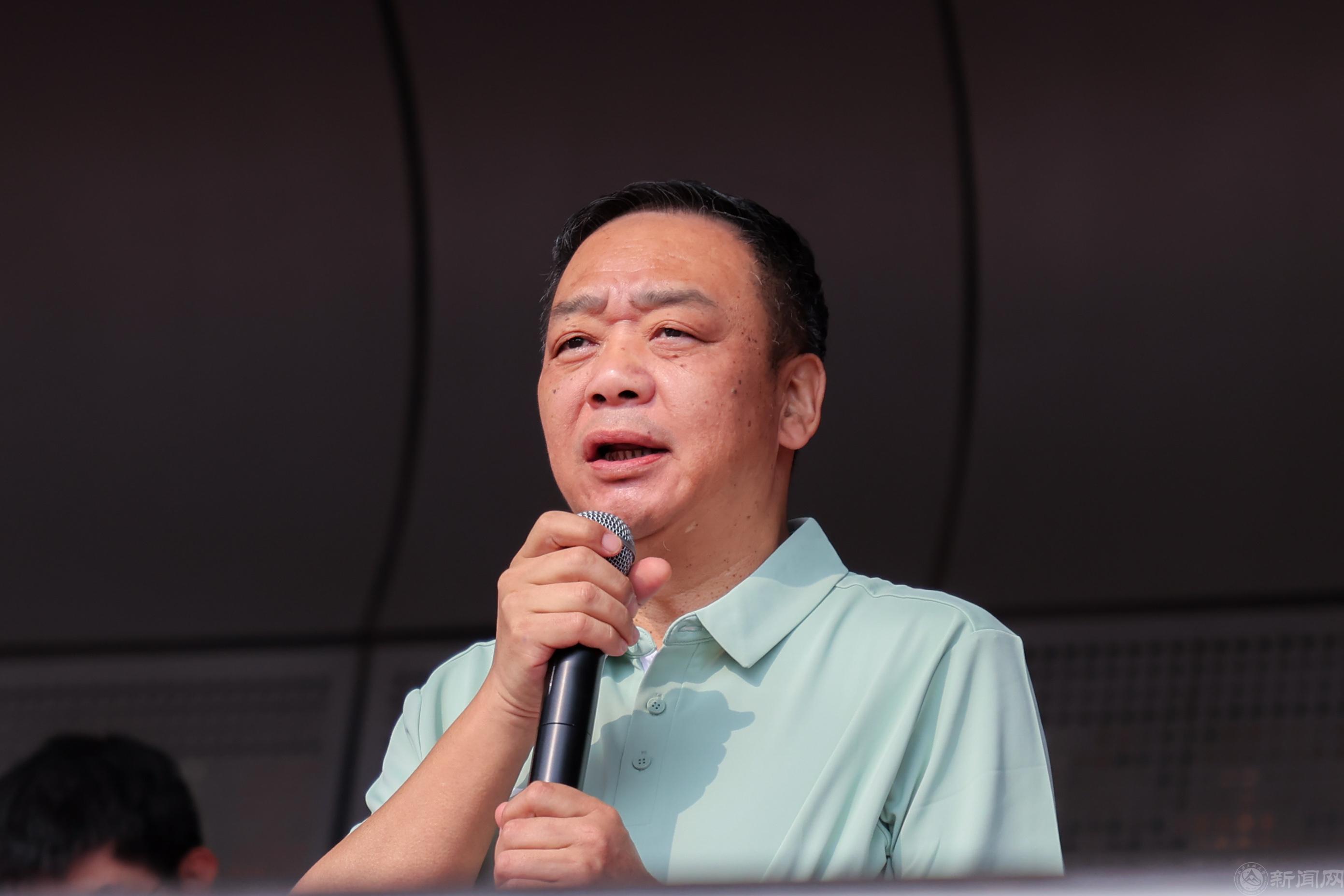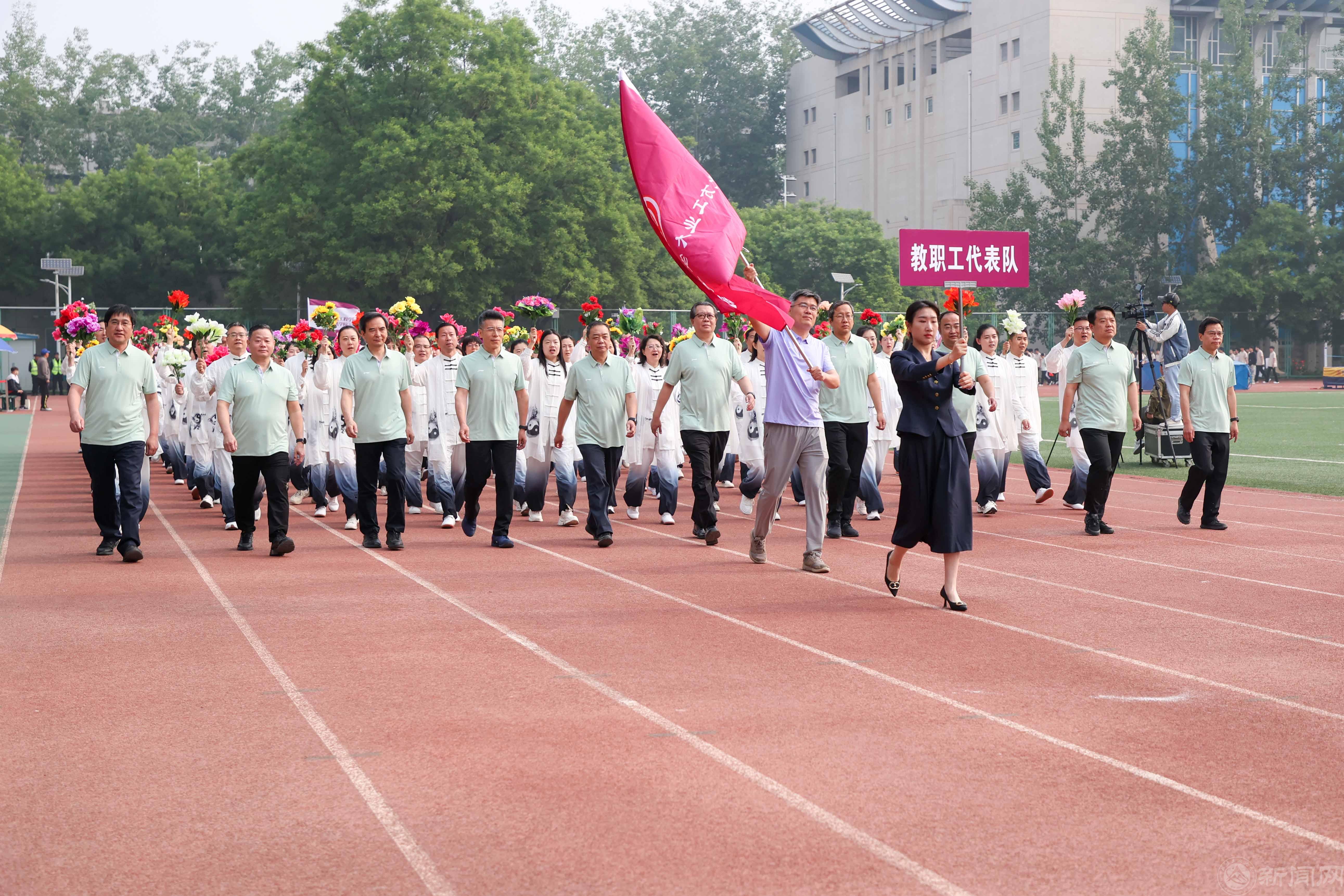 校領導劉軍、張立峰、姜孔橋、史貞軍、王建穩、王力、盧曉斌、陳群、李全明、段輝建等走在教職工方隊的最前列。