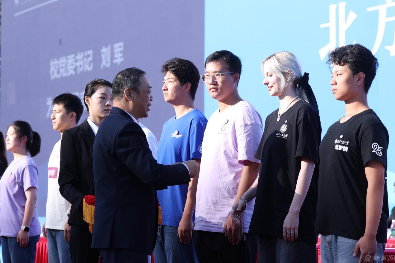黨委書記劉軍為新生代表佩戴北方工業(yè)大學(xué)校徽,歡迎2025級新同學(xué)加入北方工大,開啟人生新征程。