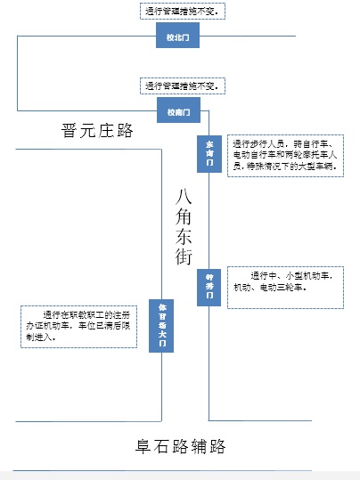 收費口只允許機動車通行(含小、中型機動車,機動、電動三輪車等);步行和騎自行車、電動自行車、兩輪摩托車人員一律從校東南門通行。北門通行措施不變。