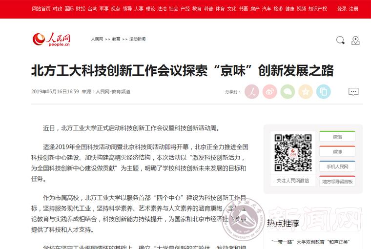 5月14日,北方工業大學科技創新工作會議隆重開幕。會議以“激發科技創新活力,為全國科技創新中心建設做貢獻”為主題,服務全國科技創新中心建設和高精尖經濟結構的構建,對于全面落實學校第八次黨員代表大會“科技高地構筑工程”任務,進一步開拓學校科技工作新局面具有重要意義。5月16日,人民網對會議進行了關注報道。