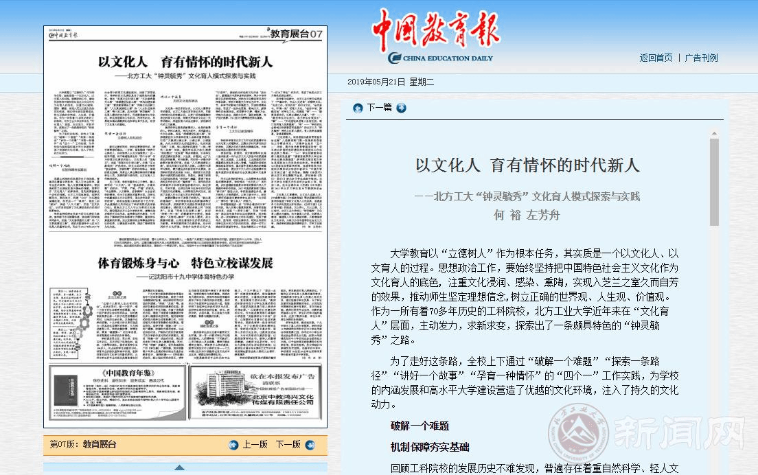 5月21日,《中國教育報》發表了我校題為《以文化人 育有情懷的時代新人——北方工業大學“鐘靈毓秀”文化育人模式探索與實踐》的署名文章。文章認為,經過多年的傳承與創新,北方工業大學構建起了“鐘靈毓秀”的特色文化育人模式:“鐘”——“凝聚思想共識,匯聚立德樹人力量”;“靈”——“激發學生內生動力,助力學生全面成長”;“毓”——“文化建設促進育人良性互動,部門協同育人效果提高”;“秀”——“學校的社會影響力和美譽度明顯提升”,這一模式育人效果顯著,取得了累累碩果。文章從“破解一個難題——機制保障夯實基礎”,“探索一條路徑——立德樹人有機結合”,“講好一個故事——無形文化有形表達”,“孕育一個情懷——工大印記家國情懷”四個方面對“鐘靈毓秀”文化育人模式進行了深入闡釋,受到媒體和社會各界的廣泛關注。