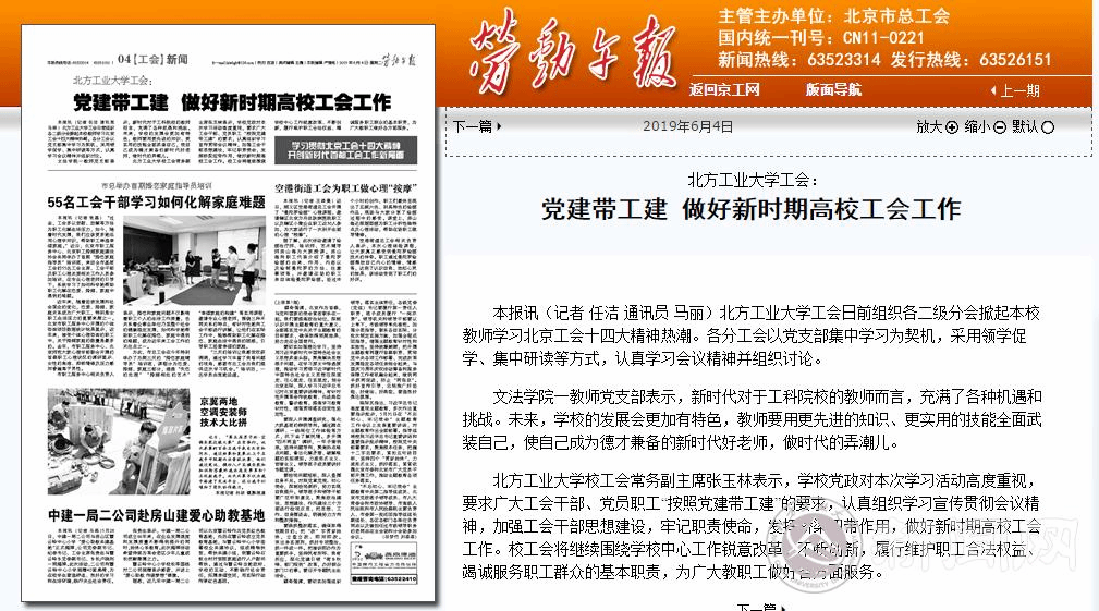 5月6日至8日,北京市工會第十四次代表大會勝利召開,為及時傳達會議精神,日前北方工業(yè)大學(xué)工會組織各二級分會掀起高校教師學(xué)習(xí)北京市工會十四大精神熱潮。6月4日,勞動午報發(fā)表了我校題為《黨建帶工建 做好新時期高校工會工作》的署名報道文章。