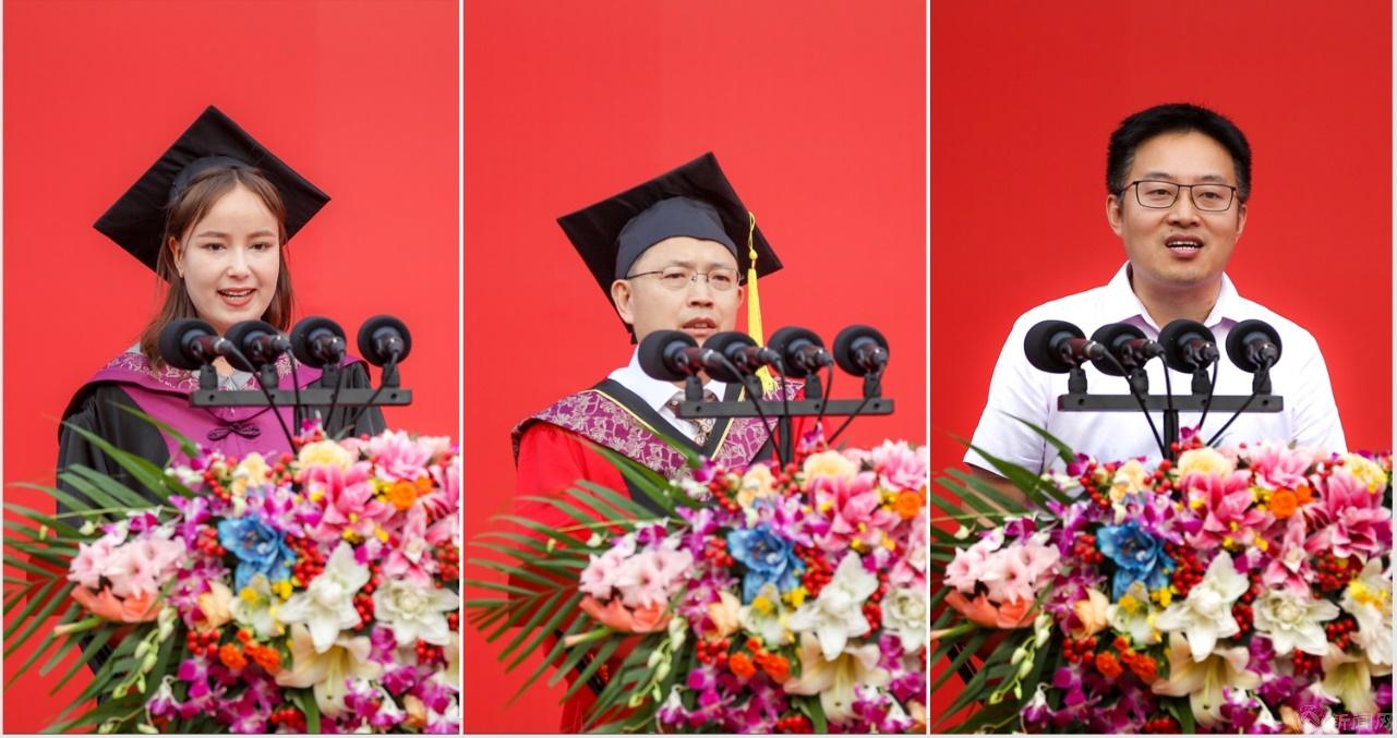 畢業生代表、經濟管理學院管20-1凱麗比努爾·阿不都如蘇力在發言中深情回顧在校學習生活美好時光,表示畢業后無論身在何方都將牢記“敦品勵學、才德并懋”校訓和“嚴肅、嚴格、嚴謹”校風,在各自領域發光發熱,為強國建設貢獻北方工大力量。教師代表、信息學院王彥平寄語畢業同學,保持對知識的渴望,養成終身學習的習慣,正確面對工作中的挫折,始終懷揣自信堅持夢想,在時代的大舞臺大顯身手。校友代表、電子信息工程專業2008屆校友、北京科技大學博士生導師張海君教授在發言中勉勵學弟學妹們要堅持學習,勇當時代弄潮兒,勇于創新敢于創新,譜寫人生新華章,積極投身強國建設,為祖國建設和民族復興添磚加瓦。