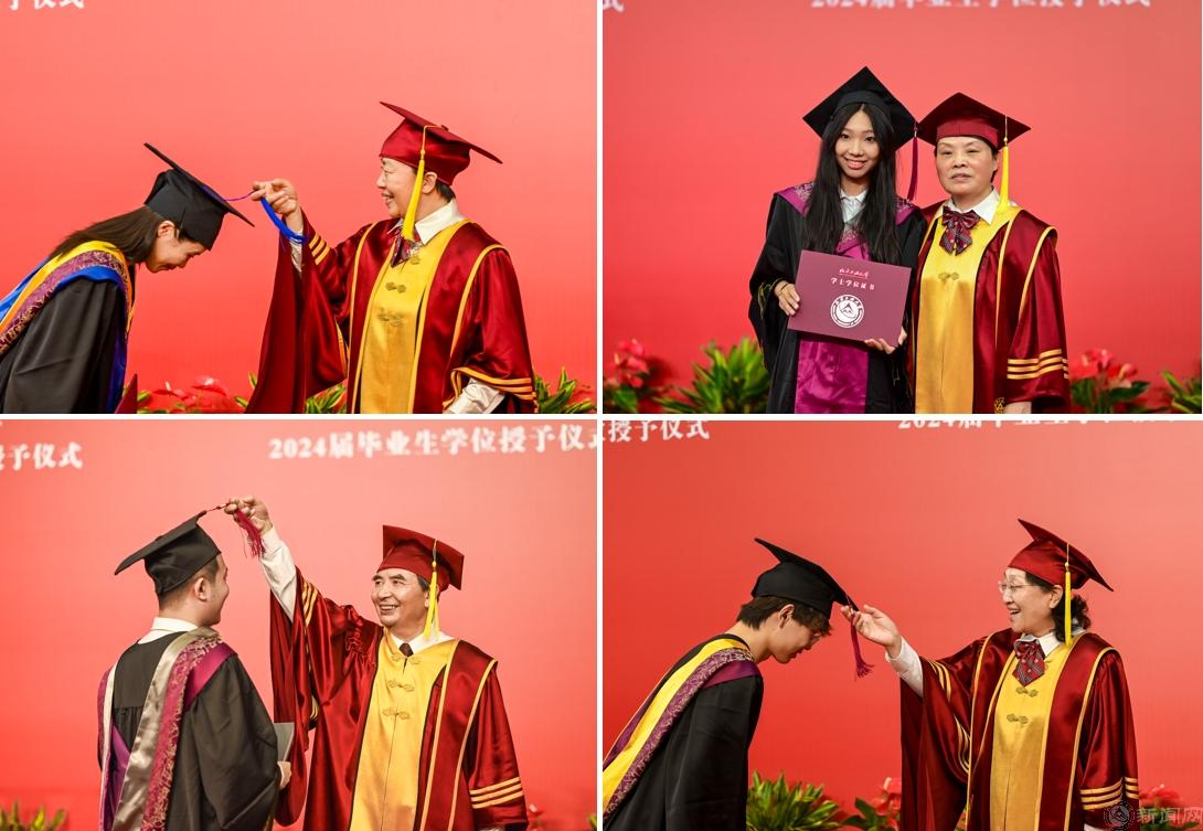 隨后,學位授予儀式在體育館二層舉行,校領導、學院領導及學位委員會委員為畢業生們一一撥正流蘇。