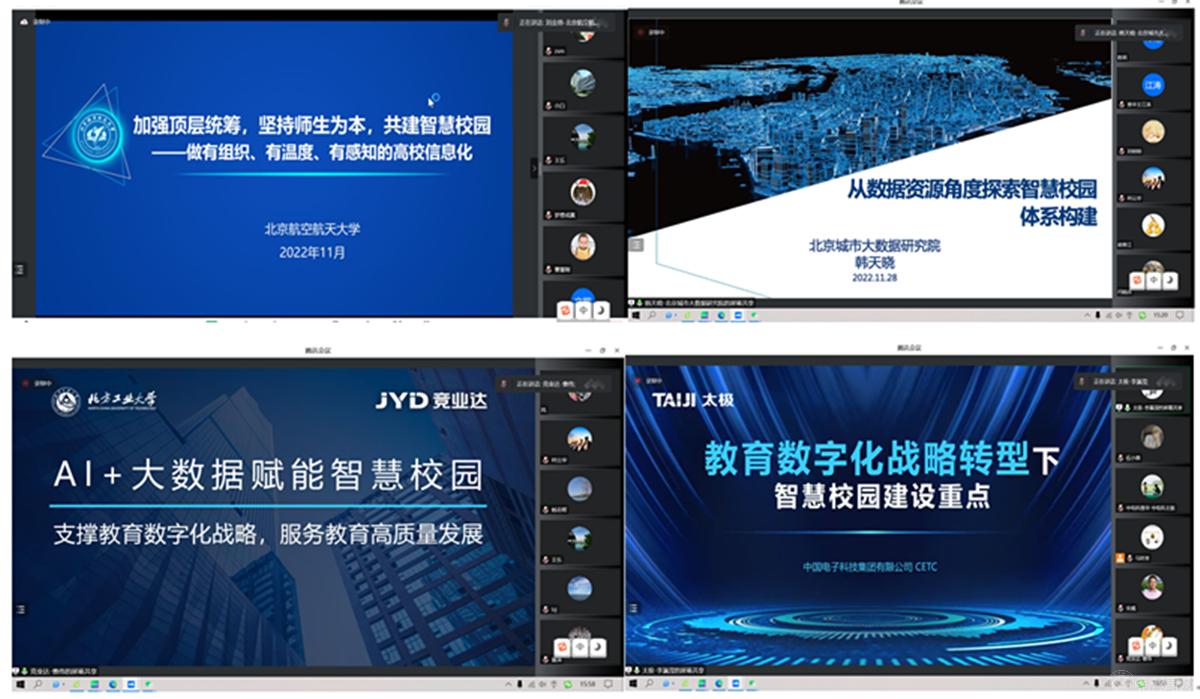 與會專家分別從《加強頂層統籌,堅持師生為本,共建智慧校園》《從數據資源角度探索智慧校園體系構建》《AI+大數據賦能智慧校園》《教育數字化戰略轉型下智慧校園建設重點》等多個維度對我校智慧校園建設的總體規劃、基礎設施、數據底座、核心技術、典型應用等關鍵問題進行了深入研討。