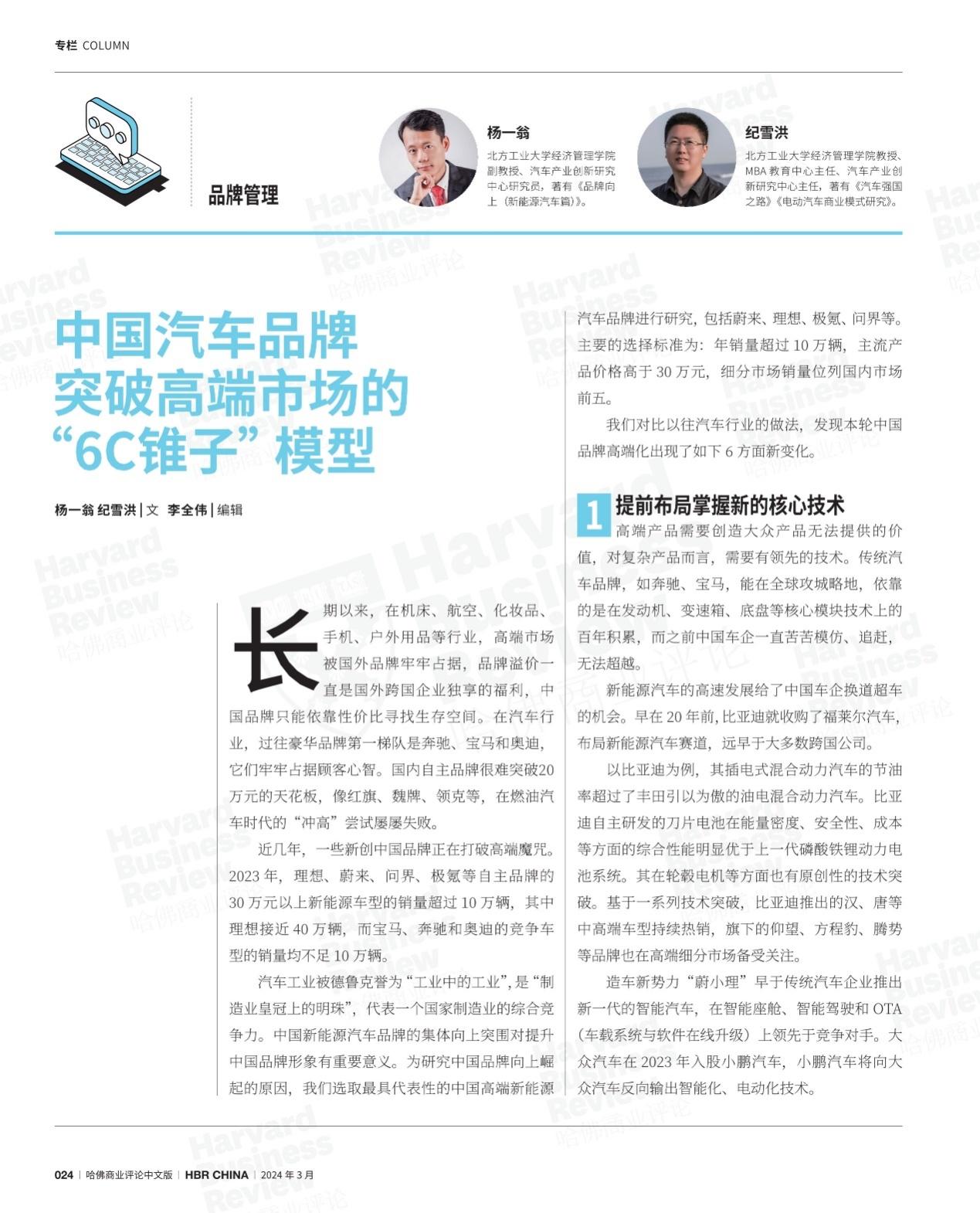 論文探討了中國新汽車品牌如何通過技術(shù)與管理創(chuàng)新,打破國外品牌在豪華汽車領(lǐng)域的品牌壟斷,總結(jié)出中國品牌突破高端市場的“6C錐子”模型。該模型是汽車高端化以及品牌高端化研究領(lǐng)域的創(chuàng)新成果,既具有理論創(chuàng)新價(jià)值,也對中國汽車品牌高端化以及其他行業(yè)企業(yè)的實(shí)踐具有重要借鑒意義。