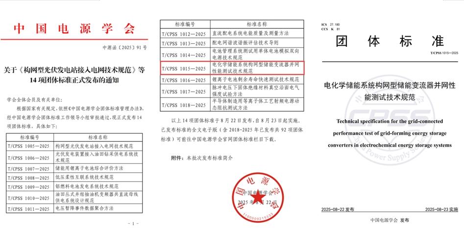 近日,由我校作為第一單位、儲能科學與工程學院周京華教授牽頭編制的團體標準《電化學儲能系統(tǒng)構(gòu)網(wǎng)型儲能變流器并網(wǎng)性能測試技術(shù)規(guī)范》(T/CPSS1015—2025)經(jīng)中國電源學會團體標準工作領(lǐng)導小組審查通過,于2025年8月22日正式發(fā)布,并于8月23日開始實施。