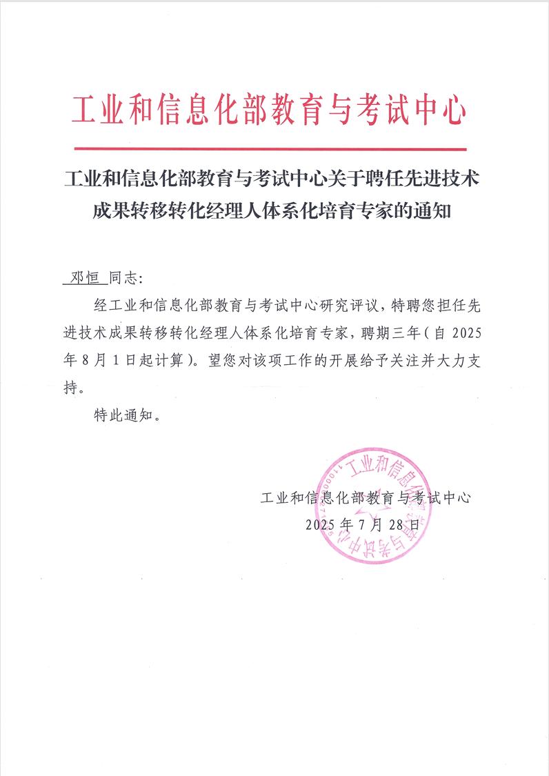 近日,從工業和信息化部教育與考試中心獲悉,我校文法學院鄧恒教授被聘為先進技術產品轉移轉化技術經理人培育專家。