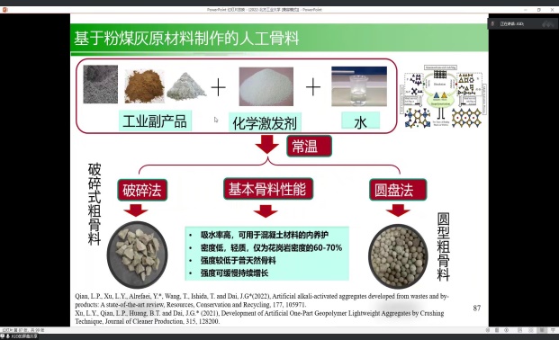10月10日下午,土木工程學(xué)院邀請香港理工大學(xué)戴建國教授以線上方式為學(xué)院師生做了題為“新型土木工程材料和結(jié)構(gòu)研究進(jìn)展”的學(xué)術(shù)報(bào)告。學(xué)院部分教師和研究生參加會議。報(bào)告會由學(xué)院副院長宋小軟教授主持。戴建國教授通過“多功能混凝土/鋼結(jié)構(gòu)表面涂層”“超高性能纖維增強(qiáng)水泥基復(fù)合材料”“纖維增強(qiáng)樹脂復(fù)合材料及結(jié)構(gòu)”“化學(xué)激發(fā)地聚物水泥/混凝土”“基于粉煤灰原材料制作的人工骨料”五個部分進(jìn)行了深入講解。報(bào)告開闊了...